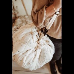קוטר המשטח הגדול והכותנה העדינה ממנה הוא עשוי, מבטיחים נוחות מקסימלית והנאה בזמן המשחק. רצועת הכתף הניתנת לכיוונון ולהסרה מספקת נוחות בשימוש, בין אם תולים את השק על הכתף או על עגלת התינוק.