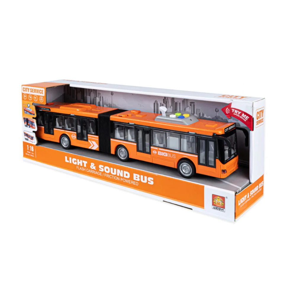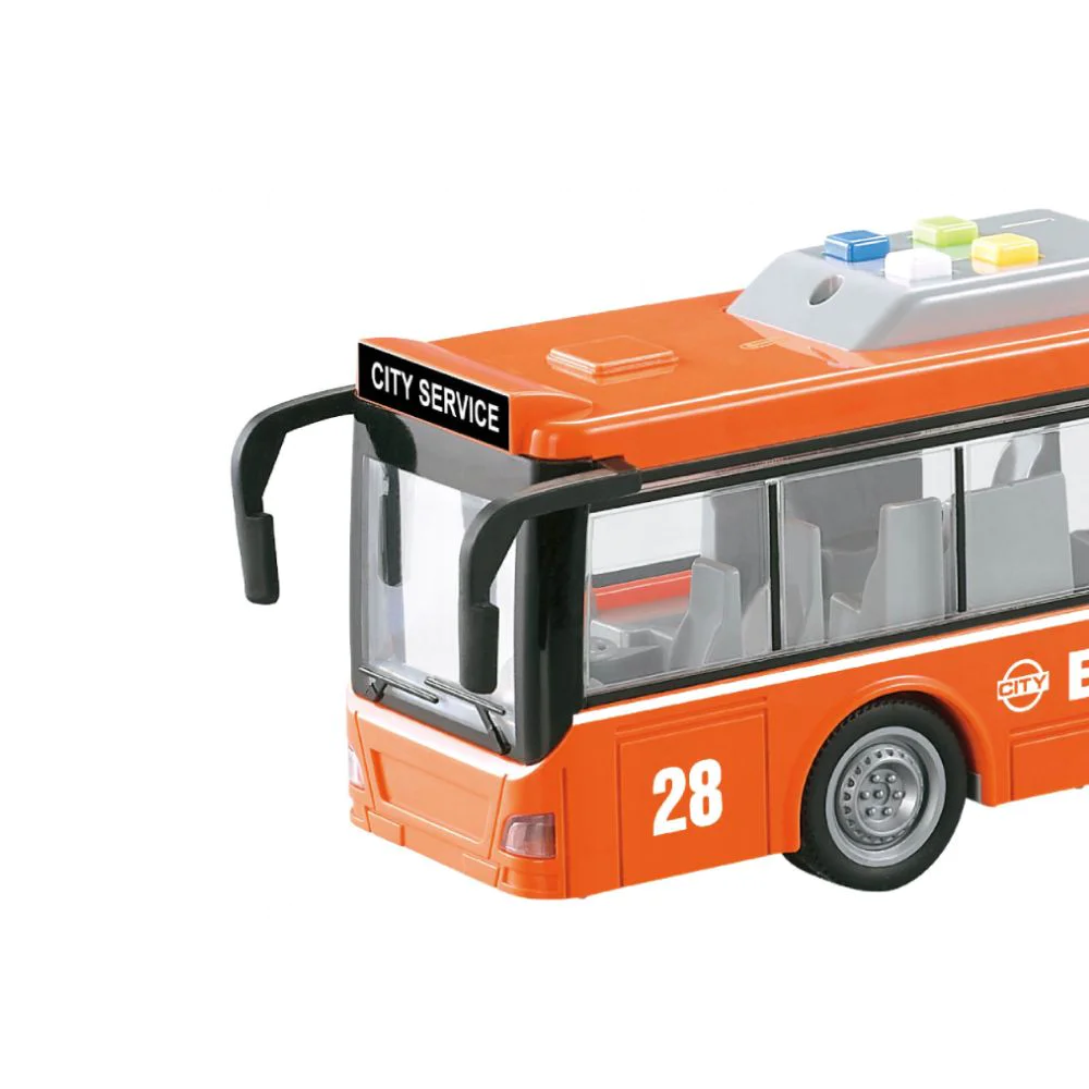 אוטובוס צעצוע עם מנגנון דחיפה שממשיך לנסוע, דלתות נפתחות, 4 צלילים אמיתיים ותאורה פנימית. כולל סוללות ועמיד לשימוש מגיל 3 ומעלה – לחוויית משחק מציאותית ומלאת כיף.