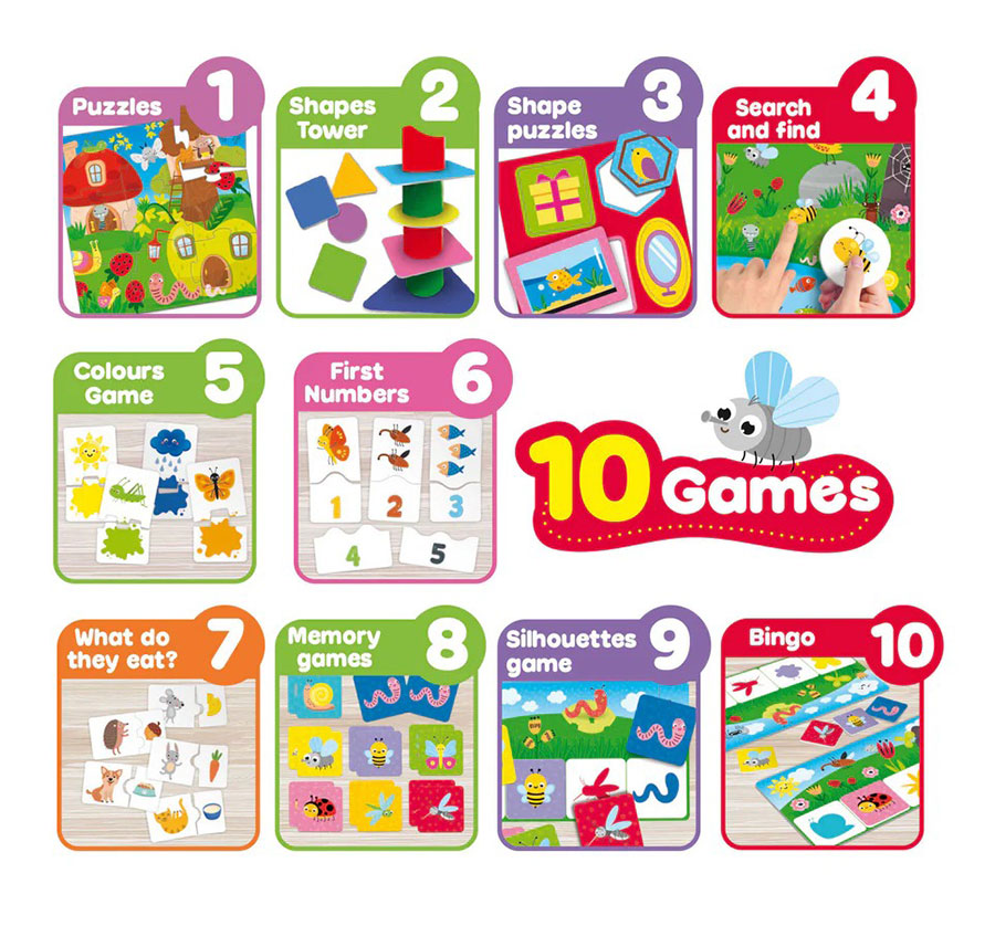 מארז עשיר הכולל 10 משחקים חינוכיים שונים לפיתוח מיומנויות חשובות אצל ילדים. המשחקים מסייעים בפיתוח מוטוריקה עדינה, קואורדינציית יד־עין, חשיבה לוגית ויכולת ריכוז, ומתאימים לילדים מגיל שנתיים ומעלה.