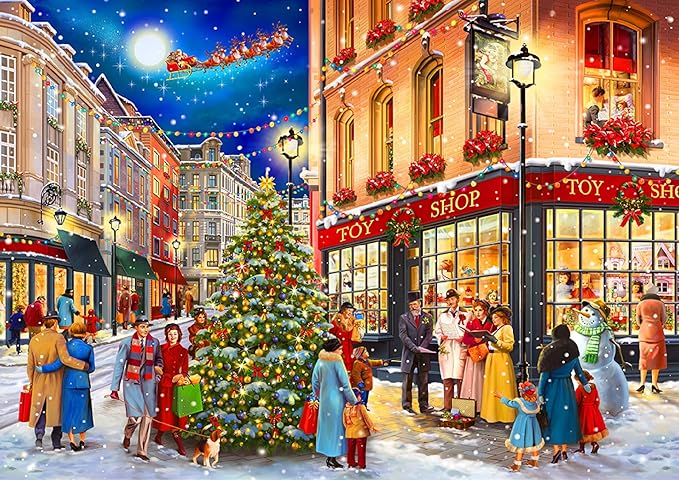 האיור מתאר כיכר עיר קסומה בלב חורף מושלג, כשסנטה קלאוס טס מעליה במזחלתו, ואורות חג מחממים את האווירה.