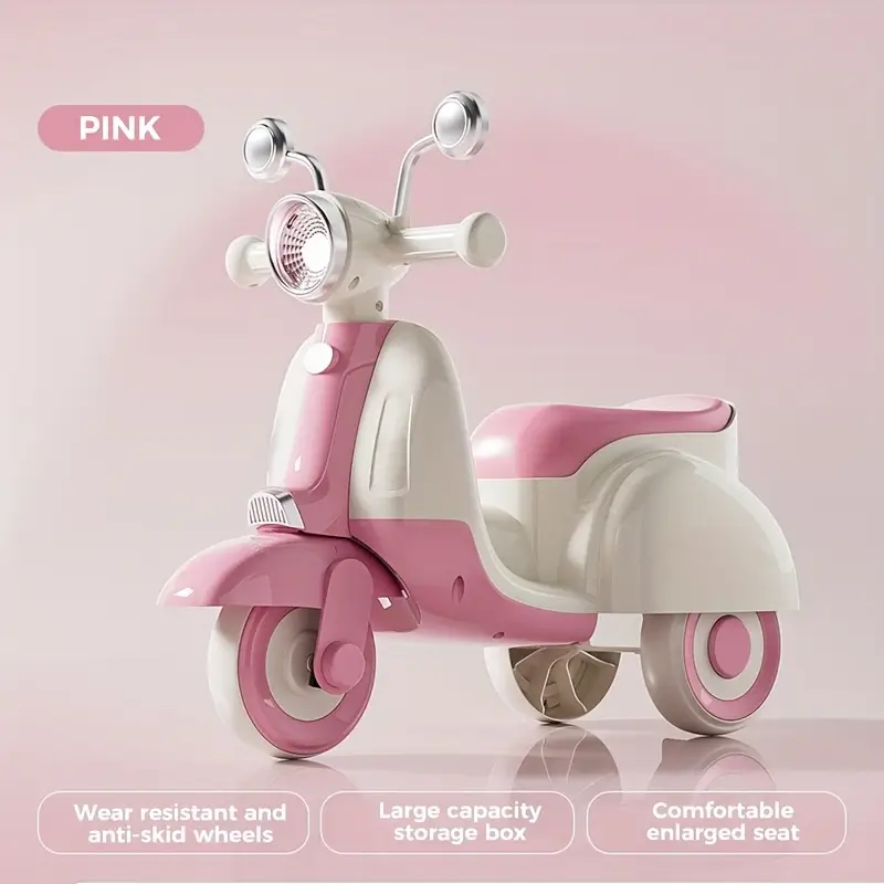 הוספה עשויה מחומרים איכותיים, בטיחותיים וקלים לניקוי, עם עיצוב ריאליסטי של קטנוע קטן בצבעים רכים ומודרניים.