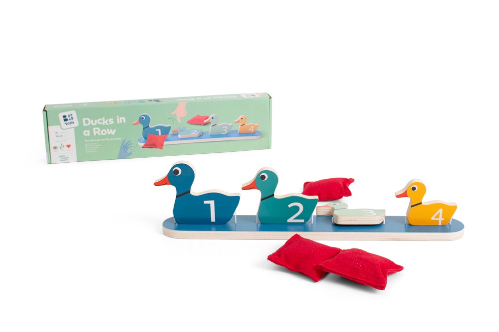 עליכם לנסות להפיל את הברווזים בעזרת השקים! לכל ברווז יש ספרה שתסייע לילדים ללמוד לספור תוך כדי משחק כיפי ומצחיק. המשחק כולל בסיס מעץ איכותי, 4 ברווזים בגודל 61040 ס"מ ו-3 שקים.