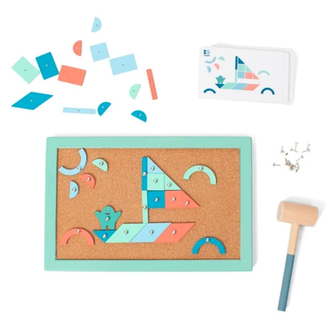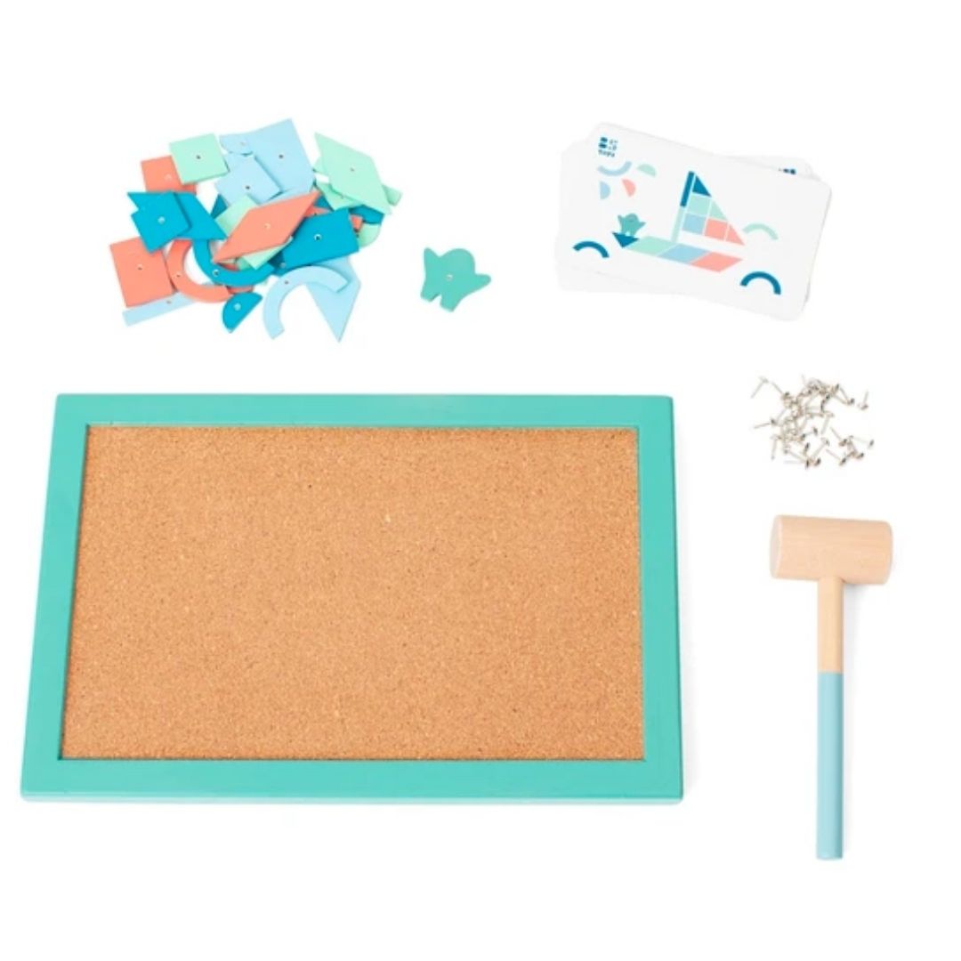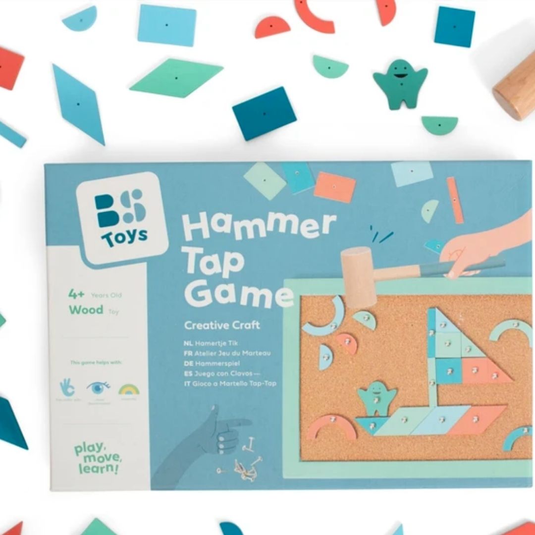 BS Toys – Hammer Tap Game הוא משחק התפתחות מעץ המשלב יצירה, דיוק והנאה. בעזרת פטיש ומסמרים הילדים בונים דגמים יפיפיים על גבי לוח שעם ענק, תוך שימוש בכרטיסיות דגם עם צורות הנדסיות צבעוניות בגוונים נורדיים רכים ונעימים לעין.