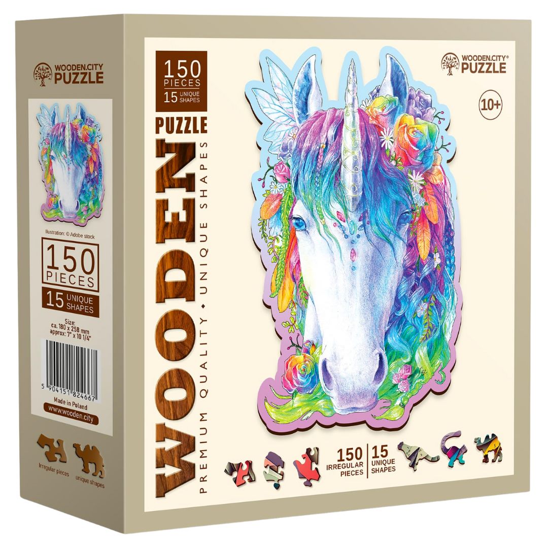 פאזל עץ פרימיום בעיצוב חד-קרן אלגנטי, עם 150 חלקים איכותיים המציעים חוויה מאתגרת ומעודנת לחובבי פאזלים בוגרים.