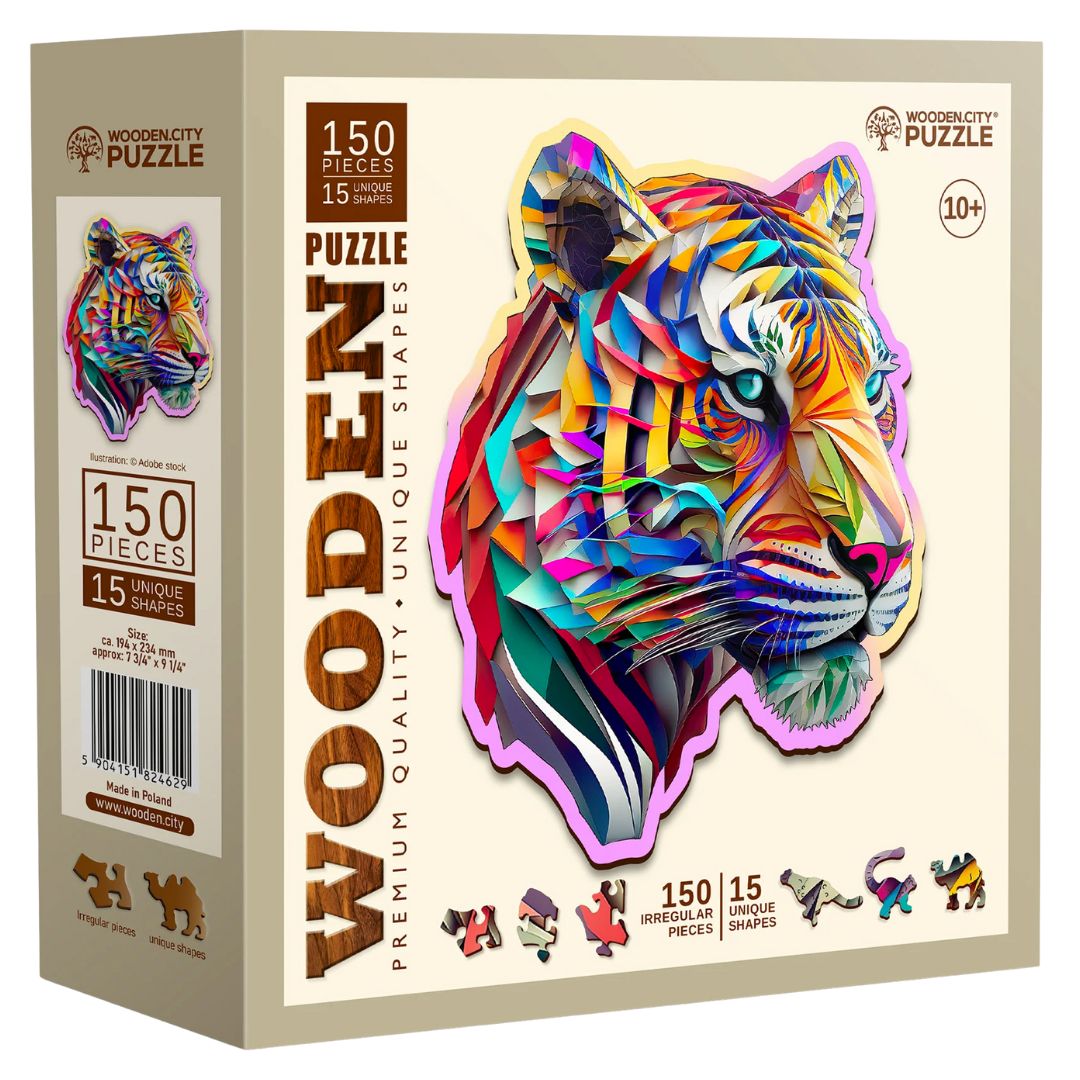 פאזל עץ בצורת ראש טיגריס עם 150 חלקים מעוצבים, כולל חתיכות מיוחדות בצורת חיות או סמלים אייקוניים. חוויה יצירתית, מאתגרת ומרהיבה לעיניים.