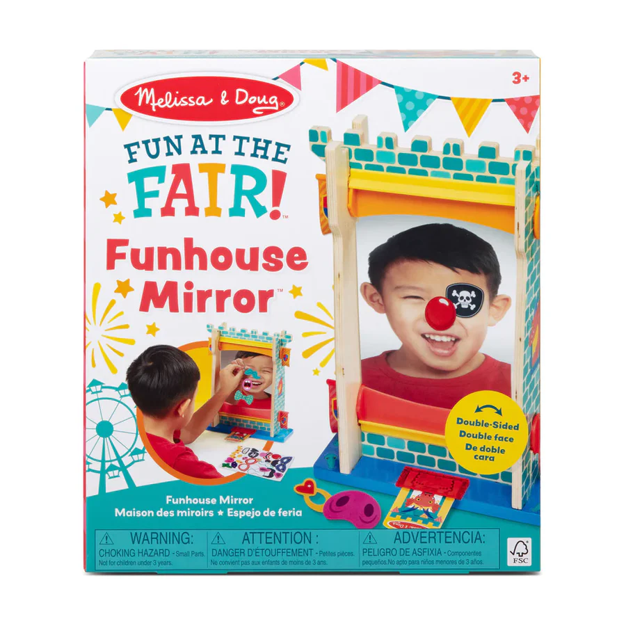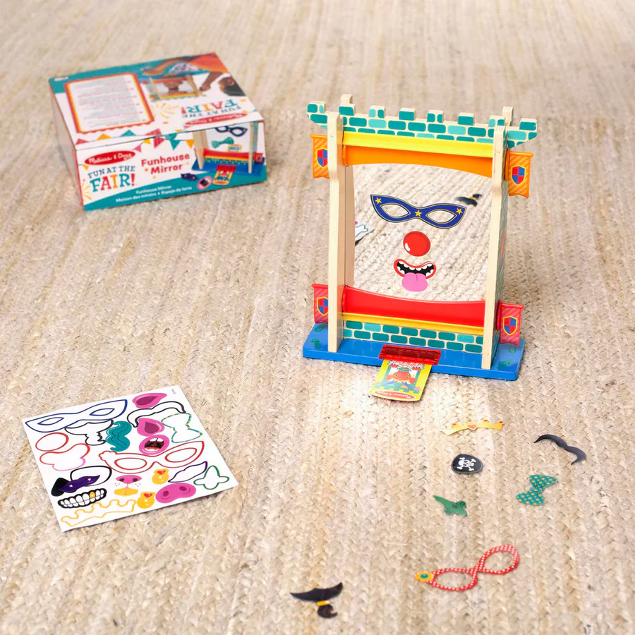כיף ביריד! – מראה מתעתעת מבית Melissa & Doug מביאה את החגיגיות והשמחה של היריד הביתי הישר לחדר הילדים. המראה הדו-צדדית מאפשרת סיבוב והשתקפויות שונות ומשונות, בעוד הילדים יכולים לקשט אותה עם 21 מדבקות רב-פעמיות – כיף, יצירתיות וצחוק מובטחים!