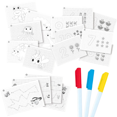 הערכה כוללת 30 כרטיסים חינוכיים המעניקים אפשרות לתרגול העתקה, למידה ופיתוח מיומנויות, וכן 3 טושים פלואורסצנטיים המאפשרים לצייר, למחוק וליצור שוב ושוב ללא הגבלה.