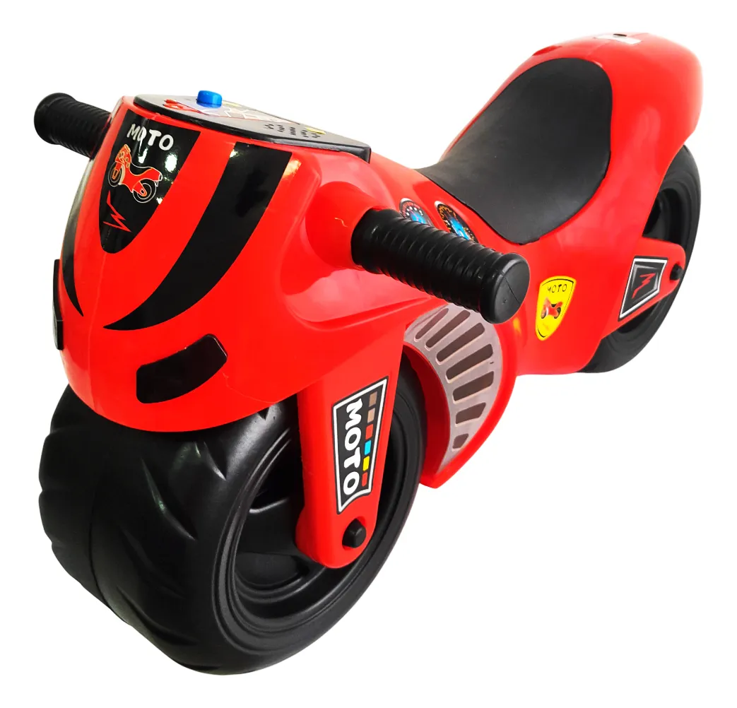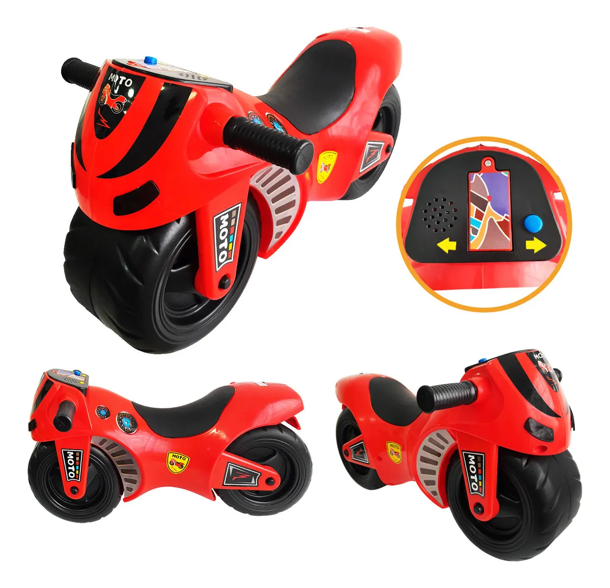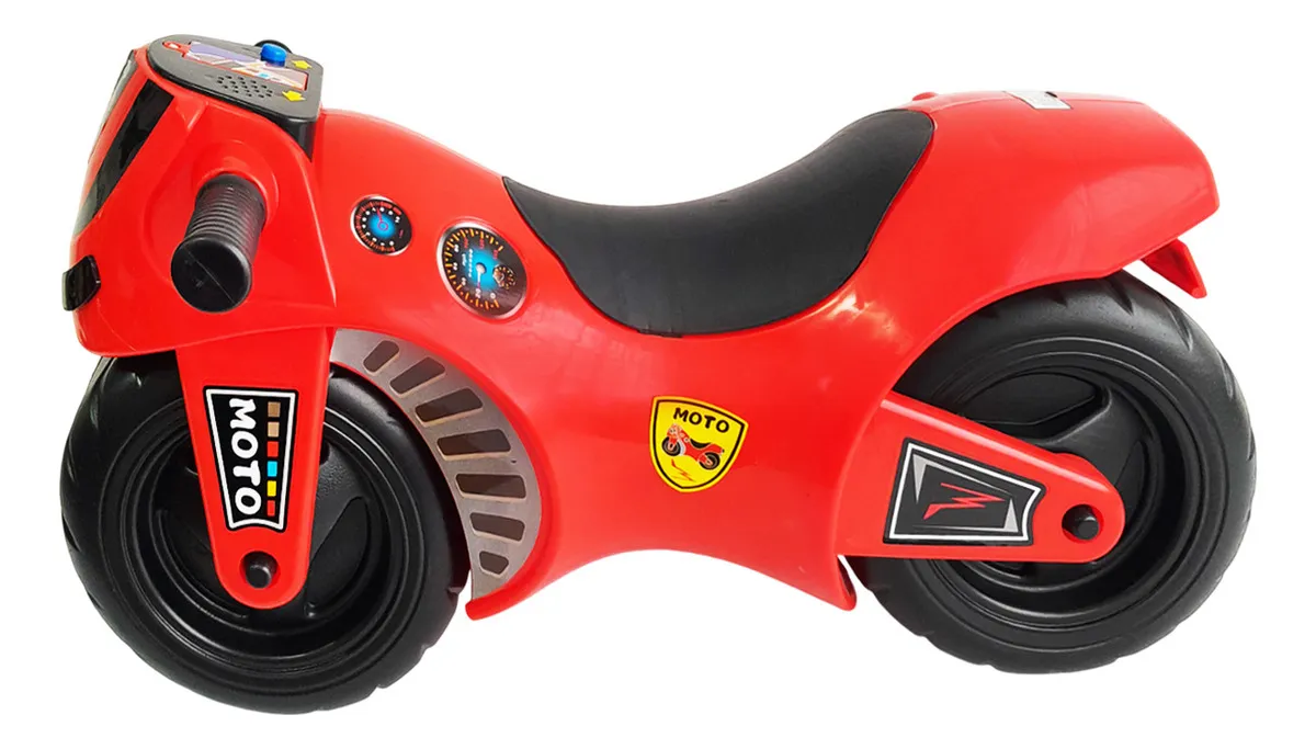 האופנוע מצויד בכידונים צדיים קבועים לנוחות ואחיזה בטוחה, ובגלגלים פלסטיים גדולים המאפשרים נסיעה יציבה וחלקה. בלחיצה על הכפתור הממוקם בחלק העליון, מתנגנות מנגינות שונות ונורות בצבעים נדלקות בפנסים הקדמיים – חוויית משחק מלאה בגירויים קוליים וחזותיים שילדים אוהבים.