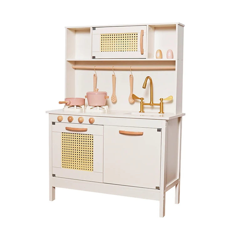 מטבח רטרו מעץ איכותי לילדים, כולל כיריים אלקטרוניים ואביזרי מטבח צבעוניים.
