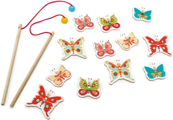 - 12 פרפרים עם נקודות בגודל 6x4x0.5 ס"מ (מגנטיים, מעץ) ושני מקלות דיג (מגנטיים, מעץ)