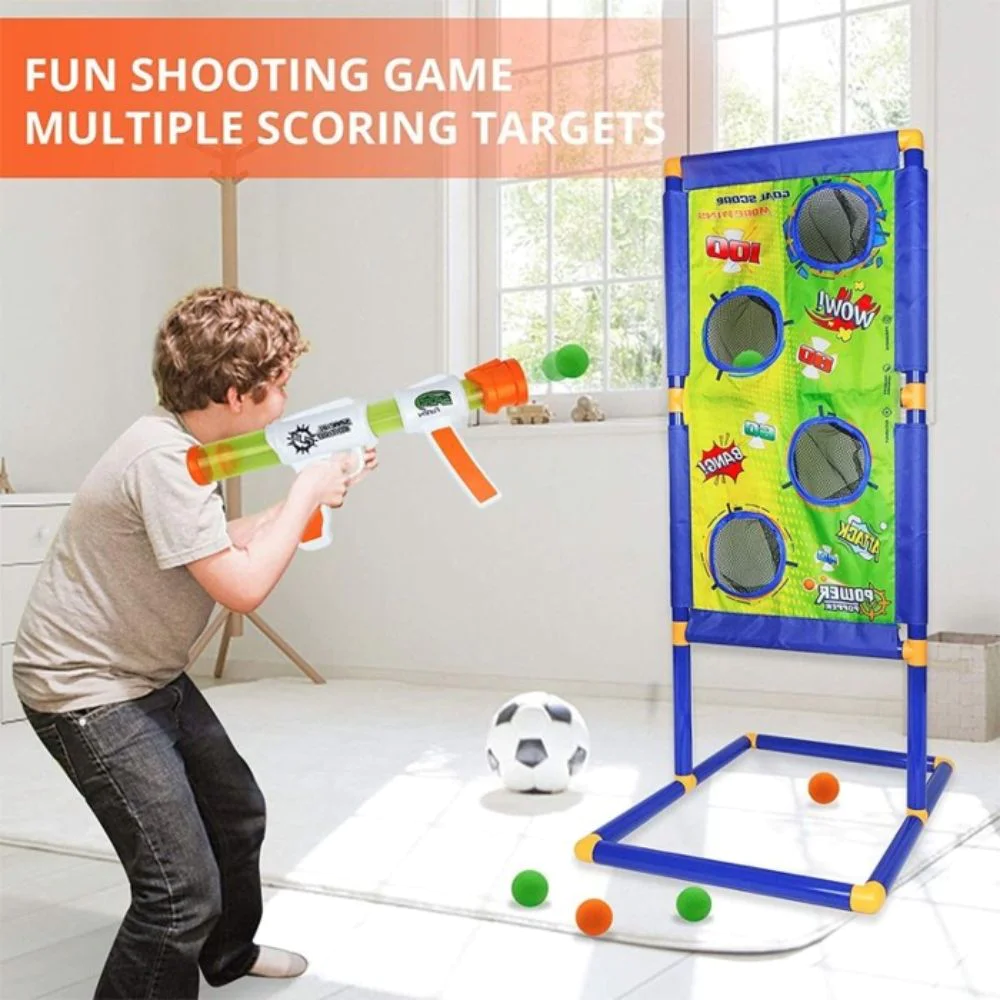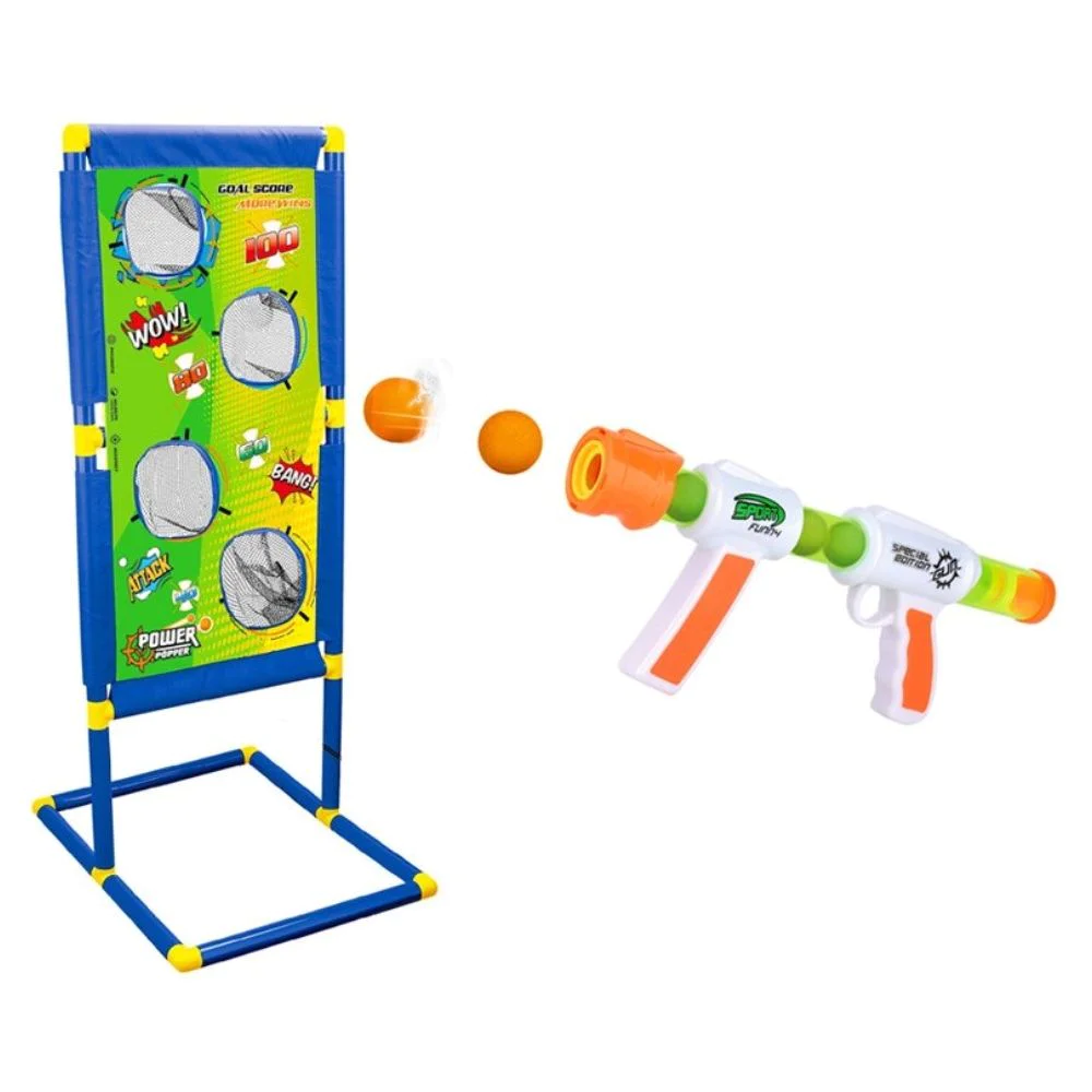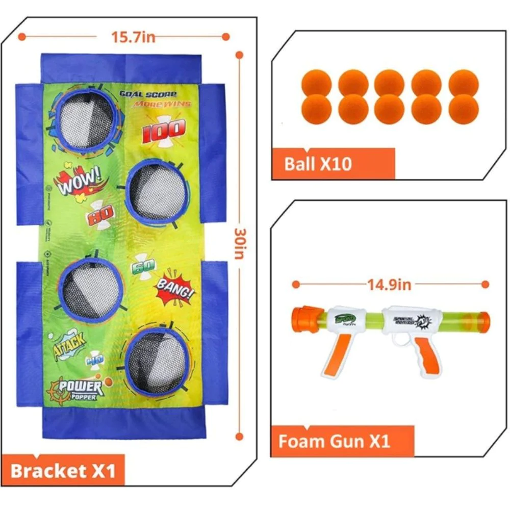 הסט כולל רובה אוויר ידני, 10 כדורי ספוג רכים ומטרה צבעונית בעיצוב צבאי מרהיב, שמזמינה את הילדים לכוון, לטעון ולשגר מחדש בכל פעם.