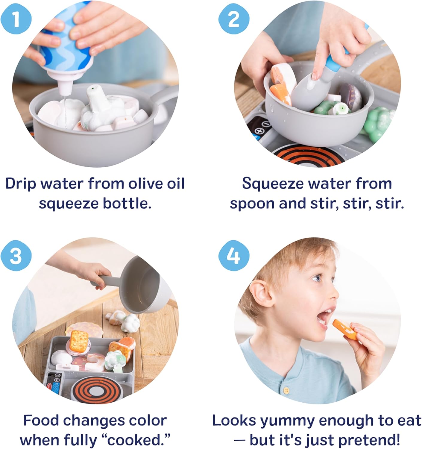 הערכה כוללת כיריים עמידות, סיר בישול, כף מיוחדת לחלוקת מים ובקבוק סחיטה, לצד מגוון פריטי מזון אינטראקטיביים: 6 ירקות משני צבע, 6 חלבונים משני צבע, ו-2 דיסקים של ארוחות שמשנים צבע. הילדים יכולים לטפטף מים בעזרת הכף או הבקבוק ולראות כיצד האוכל עובר ממצב "קפוא" ל"מבושל" – חוויה מרתקת המדמה בישול אמיתי.
