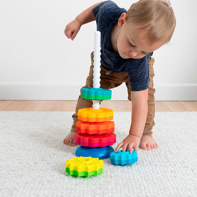צעצוע ערימה וסיבוב מהפכני! הניחו את הדיסקים הצבעוניים על מוט הברגה וצפו בהם מסתובבים ומתייצבים על הבסיס ההפיך. הבסיס ניתן להגדרה כמתנדנד או יציב. הצבעים המרהיבים והעיצובים המגוונים ישמרו על הילדים מרותקים ויעזרו בפיתוח תיאום עין-יד ומיומנויות הנדסיות מוקדמות. כולל 6 דיסקים, בסיס הפיך ומוט הברגה. לגילאי 12 חודשים ומעלה