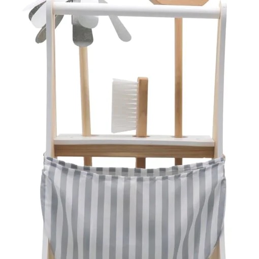 עגלה לכלי ניקוי והליכון מעץ לילדים והליכון מבית ספירלה הכוללת מעמד כלי ניקוי, מטאטא, יעה, סמרטוט ומברשת.