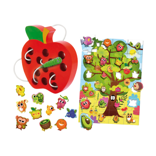 משחק חינוכי לילדים בגילאי 3–4 הכולל פאזל עץ תפוחים מעץ ומשחק השחלה עם זחל. מפתח מוטוריקה עדינה, חשיבה יצירתית וכיף אינטראקטיבי.
