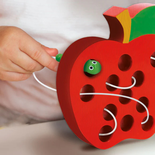 משחק השחלה עם זחל – הילדים יוצרים מסלול ומוציאים את הזחל אוכל התפוחים מהתפוחים, לפיתוח חשיבה לוגית, תיאום עין–יד ויצירתיות.