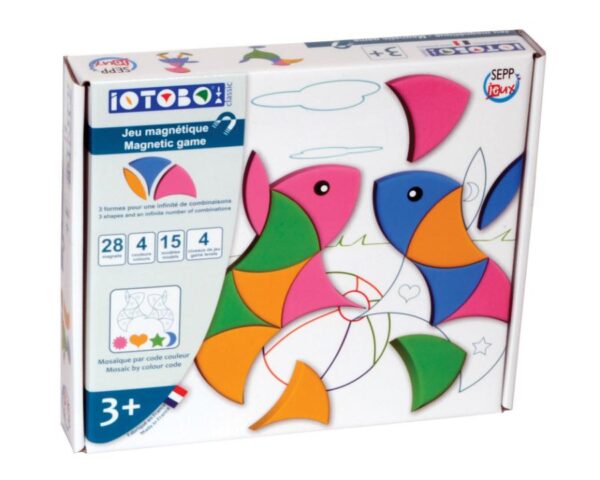 ערכת משחק מגנטים iOTOBO מבית Sepp jeux היא הדרך המושלמת לשילוב יצירתיות וכיף! הערכה כוללת לוח מגנטי נוח לשימוש, 28 מגנטים מספוג בארבעה צבעים ו-15 דגמים מודפסים שניתן להתאים לפי 4 רמות קושי שונות. המשחק מפתח את החשיבה היצירתית, היכולות המוטוריות והיכולת להבחין בצורות וצבעים.
