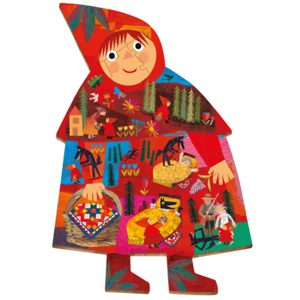 האגדה של כיפה אדומה מתגלה על ידי הרכבת, חתיכה אחרי חתיכה, את הפאזל מעץ המגולף ומשחקת עם הדמויות מעץ על הבמה המאויירת.