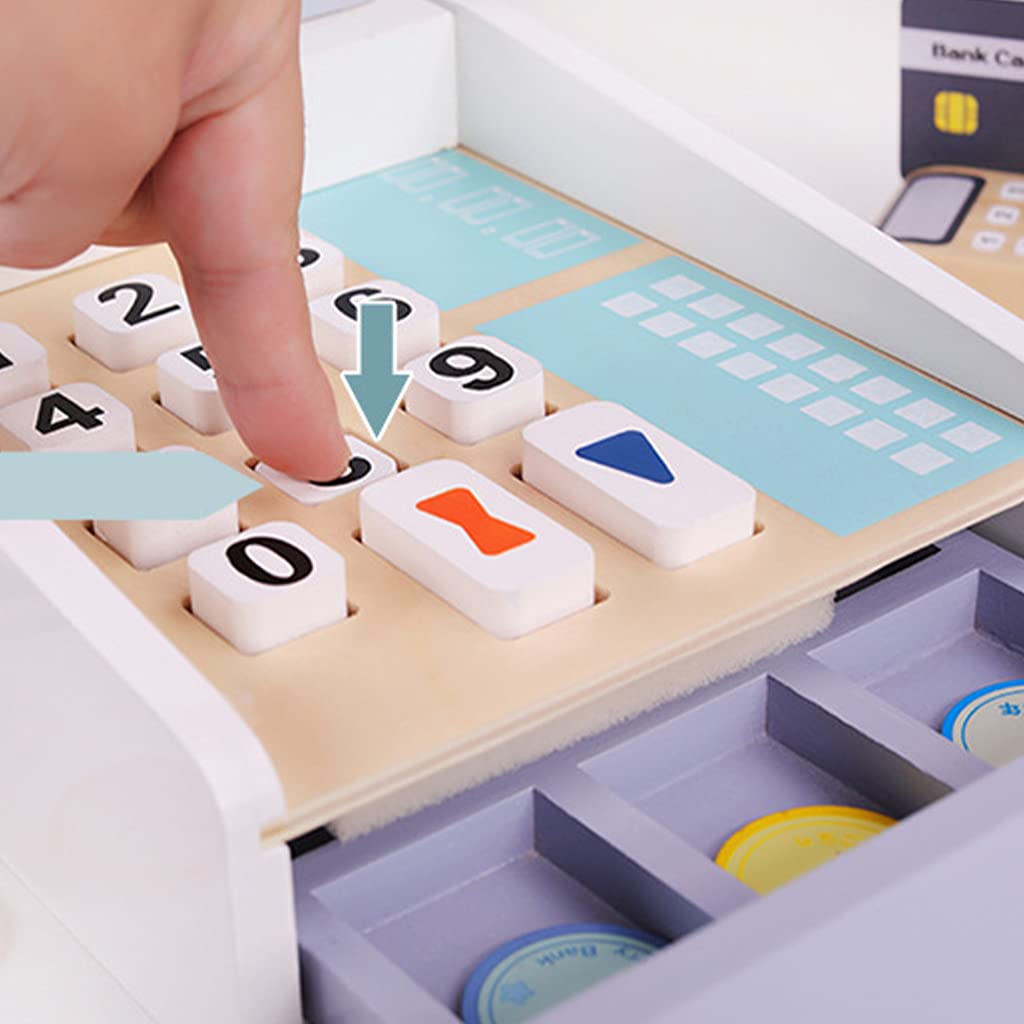 קופה מעץ עם מגירה נפתחת, מטבעות, כרטיס אשראי ומחשבון – חוויית קניות אמיתית לילדים שאוהבים לשחק “כאילו באמת”!
