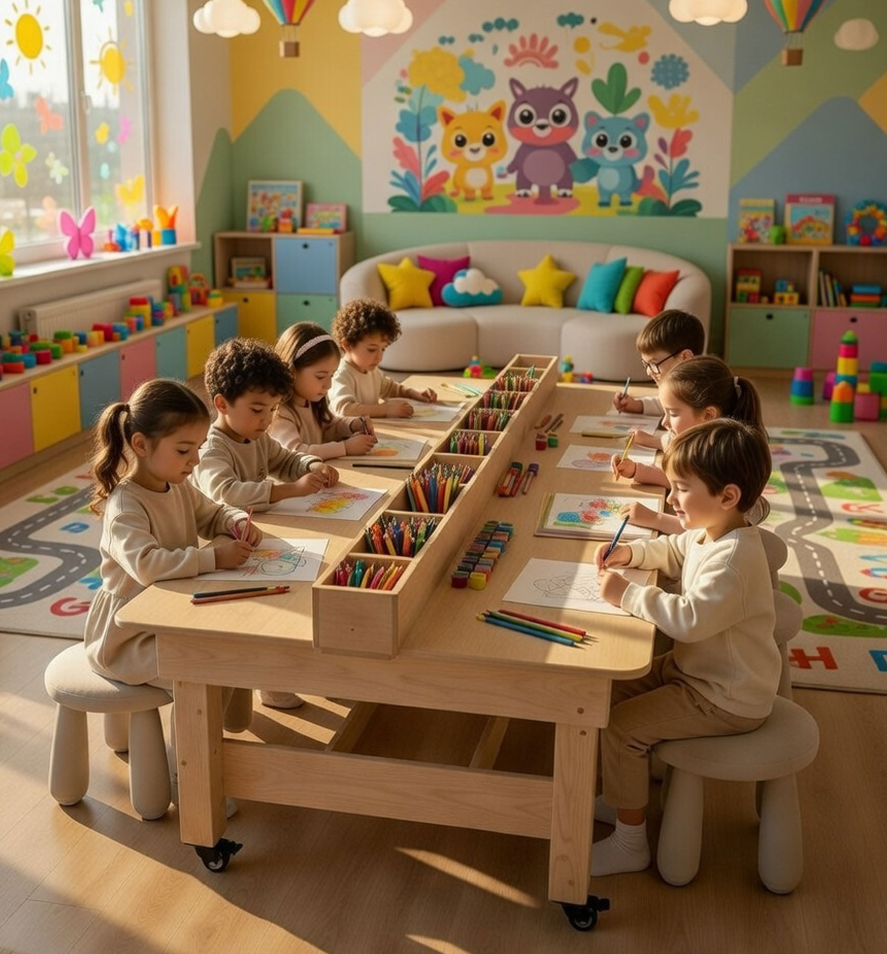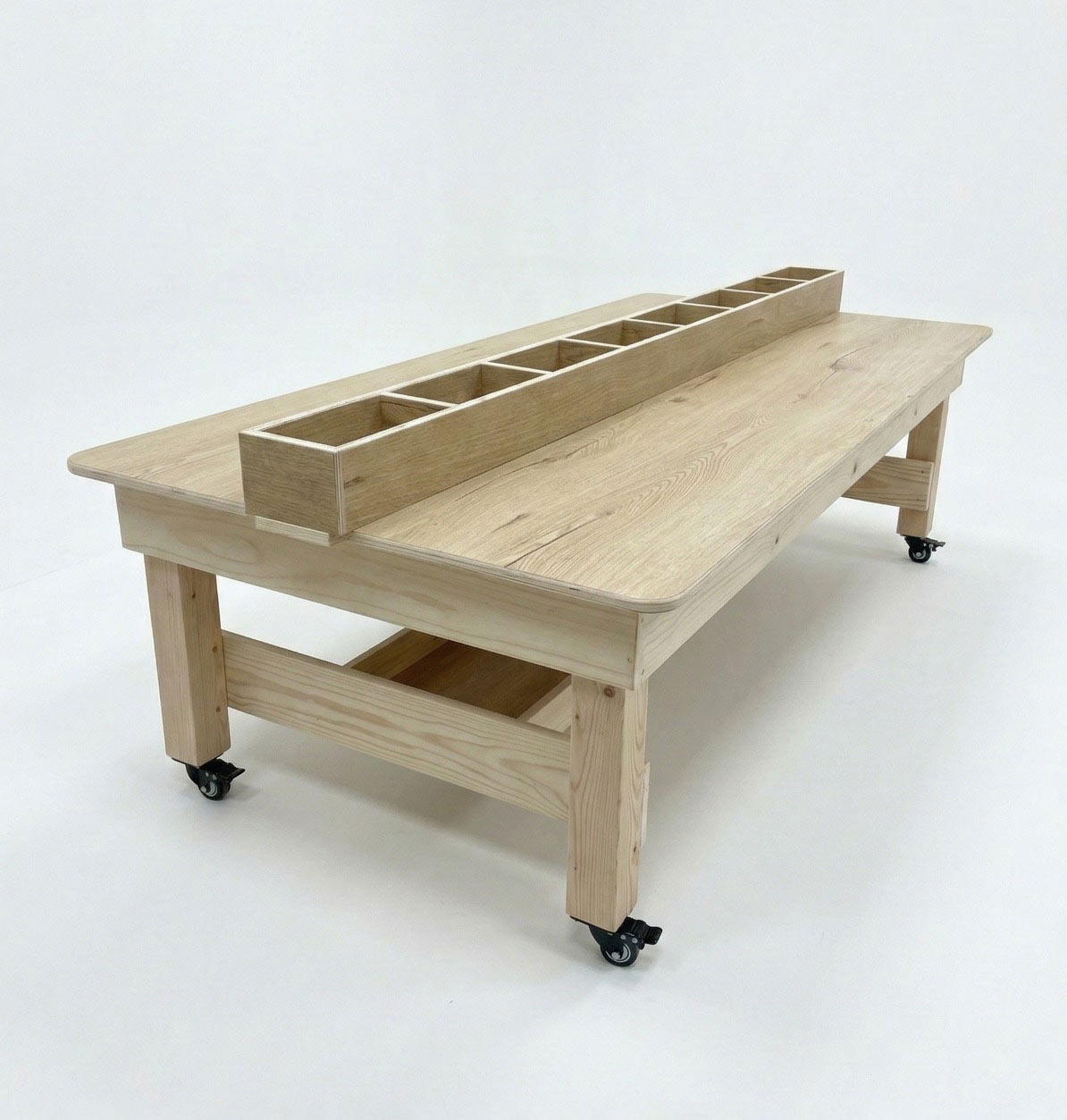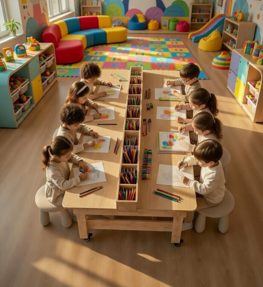 שולחן עץ גדול ואיכותי ל־4 ילדים, עם תא אחסון נפתח, מקום ייעודי לציוד אישי, גלגלים נוחים להזזה ומעצור בטיחות ליציבות מלאה.