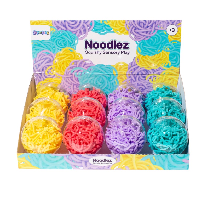 Noodlez הוא משחק תחושתי מושלם המשלב מרקם רך וייחודי וצבעים מרהיבים המזמינים את הילדים לחקור, ליצור ולשחק תוך פיתוח היצירתיות והדימיון. חוויה מרתקת של משחק, למידה והנאה בקופסה צבעונית אחת.